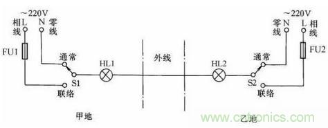 在某些生產(chǎn)過程中,需要兩地的生產(chǎn)人員能傳遞簡單的信息,以協(xié)調(diào)工作。圖22所示是用一根導線傳遞聯(lián)絡(luò)信號線路。兩地中各有一只雙擲開關(guān)控制信號燈聯(lián)絡(luò),信號燈分別裝在兩地,一地一個。當甲地向乙地發(fā)聯(lián)絡(luò)信號時,撥動開關(guān)S1,乙地的指示燈亮,待乙地完成甲地所指示的任務后,乙地可把開關(guān)撥至“聯(lián)絡(luò)”位置,通知甲地工作已完成。