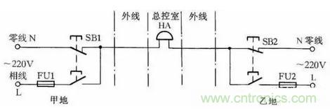 圖23所示線路可使甲乙兩地都能向總控制室發(fā)聯(lián)絡(luò)信號。當甲地向總控制室發(fā)信號時,按下按鈕SB1,控制室的電鈴告警。同理當乙地向總控制室發(fā)信號時按下SB2即可。甲乙兩地信號可用信號鈴聲的時間長短或次數(shù)區(qū)分。