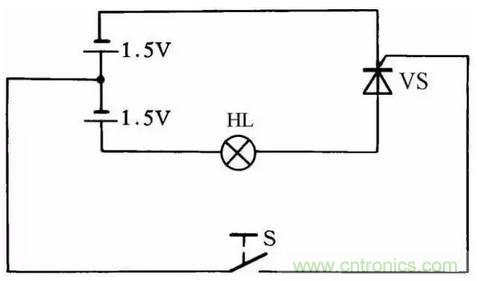 利用圖30所示的簡便方法可檢查晶閘管的好壞。當開關(guān)S斷開時燈泡不亮,而當開關(guān)S閉合后燈泡發(fā)亮,說明晶閘管能導通工作,否則晶閘管就是壞的。此方法對一般晶閘管均能測試,燈泡選用1.5V小電珠燈泡。