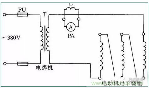 通入電動機繞組線圈的電流可由電焊機來調(diào)節(jié),但在烘干時應注意通入電動機的電流不能超過電動機本身額定電流太多,并且注意觀察電動機和電焊機溫度都不能升得過高。線路參見圖31。
