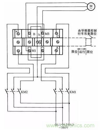 這里介紹一種常用限位器接線方法,這種限位器主要用于行車的上下電動機限位。當?shù)蹉^高于限制位置時,它會使電動機自動斷開電源。這種方法一般是斷開主電機電源線,而不是用控制線控制接觸器通斷電動機停止限位,其優(yōu)點是萬一接觸器觸點熔在一起不能斷開時,限位器同樣能起到保護限位的作用。其接線方法如圖38所示。