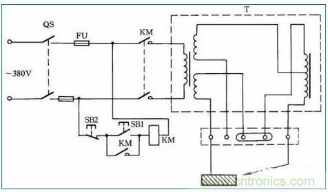 交流電焊機一般接法如圖39所示。當合上刀閘QS時,按下按鈕SB1,接觸器KM得電吸合;松開按鈕SB1時,KM自鎖觸點自鎖,電焊機繼續(xù)得電工作。當按下SB2時,電焊機停止工作。
