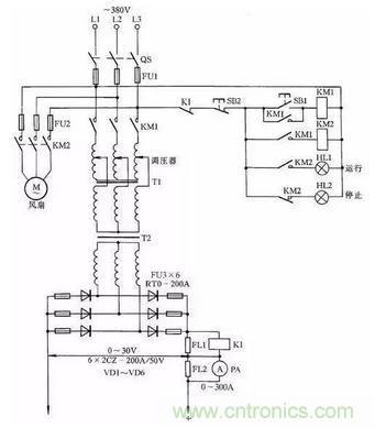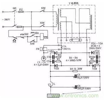 電路中VD1~VD4為4只硅整流二極管;R1~R4、C1~C4組成硅整流器件的過壓保護電路;FR為過流繼電器,保護硅整流器件。當負載電流超過額定值時,電流互感器次級電流相應增加,帶動繼電器FR動作,F(xiàn)R常閉觸點打開,接觸器KM釋放,觸點打開切斷電焊機電源。硅整流器件用0.25kW風扇作風冷設(shè)備。圖中,C5為濾波電容,R5為泄放電阻。