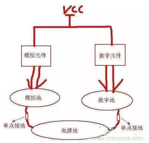 從這個(gè)圖可以看出:模擬地和數(shù)字地是完全分開的,最后都單點(diǎn)接到了電源地,這樣可以防止地信號的相互串?dāng)_而影響某些敏感元件,眾所周知數(shù)字元件對干擾的容忍度要強(qiáng)于模擬元件,而數(shù)字地上的噪聲一般比較大所以將它們的地分開就可以降低這種影響了。還有單點(diǎn)接地的位置應(yīng)該盡量靠近板子電源地的入口(起始位置),這樣利用電流總是按最短路徑流回的原理可將干擾降到最小。