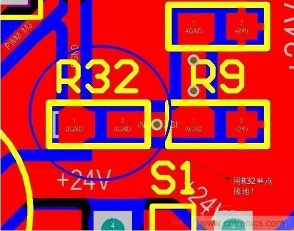 從此圖可以看出:只在電源地和數(shù)字地之間用一個(gè)0歐電阻或磁珠之類的單點(diǎn)接地就行了,同樣單點(diǎn)接地的位置應(yīng)該盡量靠近板子電源地的入口(起始位置)。