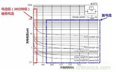 圖1中顯示了KEMET公司“FC系列”產(chǎn)品在室溫下的漏電流特性和測量電路。當超級電容器充電時,存在穩(wěn)定的寄生電流(Parasitic Current)。超級電容器通過離子“吸收”和“釋放”造成充電,并且當離子試圖到達活性炭的細孔內(nèi)部時,充電開始時的寄生電流很高。該初始電流稱為“吸收電流”。該充電電流隨著時間的推移而減小,并且隨著時間的推移變得穩(wěn)定。在開始施加電壓30分鐘后的主電流分量是吸收電流。當吸收電流減小時,漏電流成為主要成分。