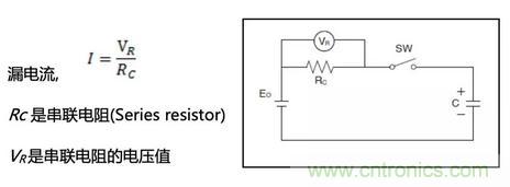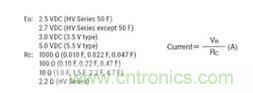 除了部份生產(chǎn)商直接提供參數(shù)值外,“漏電流值”可通過向超級電容器施加電壓直至特定時間后測量電阻器兩端的電壓,再根據(jù)以下簡單方程計算便能得出。