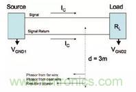 圖1:電路回路中的共模電流。電路中的源是一個數(shù)字信號(帶諧波),其負(fù)載被假定為阻性。因為遠(yuǎn)端導(dǎo)線上的相電流和近端導(dǎo)線上的相電流的流向是相同的,所以其合成相量相較于差模電流產(chǎn)生的相量會更大。在這種情況下,為了限制輻射發(fā)射的水平,降低諧波成分的大小(減慢數(shù)字信號的上升/下降時間)或者轉(zhuǎn)移/限制共模電流是非常重要的。