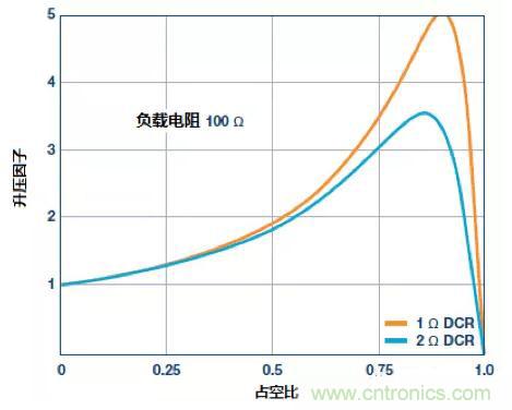 圖2中曲線(xiàn)的變化真實(shí)地顯示出輸出端負(fù)載電阻和電感的直流電阻的改變,對(duì)升壓因子造成的影響。假設(shè)負(fù)載電阻為100Ω,48V的輸出電壓,這對(duì)應(yīng)于負(fù)載電流480mA。當(dāng)電感的串聯(lián)電阻(DCR)只有2Ω,最大升壓因子是有可能剛好超過(guò)3; 但對(duì)于DCR為1Ω,略高于5的升壓因子是可以實(shí)現(xiàn)的。如要求更高的升壓因子,就必須選用具有更低的串聯(lián)電阻值的電感。