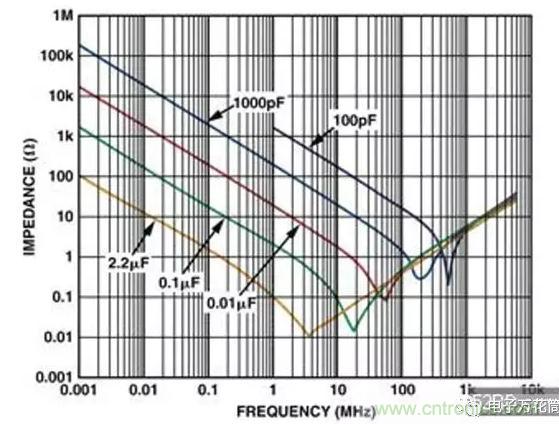 并聯(lián)不同電容值的電容器有助于確保電源引腳在很寬的頻帶上出現(xiàn)很低的交流(AC)阻抗。這對于在運算放大器電源抑制比(PSR)衰減頻率處尤其重要。該電容器有助于補償放大器降低的PSR。在許多十倍頻程范圍內(nèi)保持低阻抗的接地通路將有助于確保有害的雜訊不能進入運算放大器。(圖一)顯示採用多個并聯(lián)電容器的優(yōu)點。在低頻段,大的電容器提供低阻抗的接地通路。但是一旦頻率達到了它們自身的諧振頻率,電容器的相容性就會減弱,并且逐漸呈現(xiàn)出電感性。這就是為什么採用多個電容器是很重要的原因:當一個電容器的頻率回應開始下降時,另一個電容器的頻率回應開始其作用,所以能在許多十倍頻程范圍內(nèi)保持很低的AC阻抗。