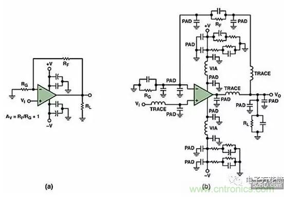 所謂寄生效應,按照字面意思就是那些出現(xiàn)在PCB板中并在電路中大施破壞、令人頭痛且原因不明的小故障。它們就是滲入高速電路中隱藏的寄生電容和寄生電感。其中包括由封裝引腳和印制線過長所形成的寄生電感;焊盤(pad)到地、焊盤到電源平面和焊盤到印制線之間形成的寄生電容;通孔之間的相互影響,以及許多其他可能的寄生效應。(圖三)(a)顯示一個典型的同相運算放大器原理圖。但是,如果考慮寄生效應的話,同樣的電路可能會變成圖三(b)那樣。