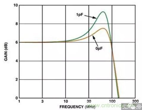 在高速電路中,很小的值就會影響電路的性能。有時候電容值幾十個pF的電容就足夠了。相關實例:如果在反相輸入端僅有1pF的附加寄生電容,它在頻率域可以引起差不多2dB的尖脈沖,如(圖四)。如果寄生電容足夠大的話,它會引起電路的不穩(wěn)定和震盪。