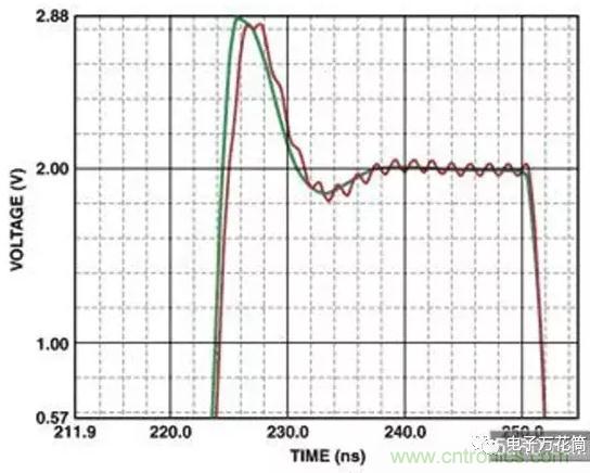 (圖七)中的震盪顯示高速運算放大器同相輸入端長度為2.54cm的印制線的影響。其等效寄生電感為29nH(10-9H),足以造成持續(xù)的低壓振蕩,會持續(xù)到整個瞬態(tài)回應周期。圖七還顯示了如何利用接地平面來減小寄生電感的影響。