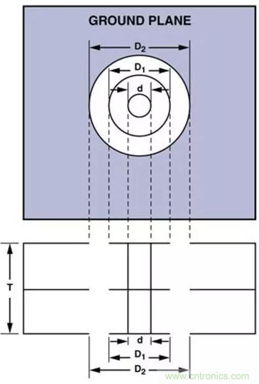 εr表示PCB材料的相對磁導率。T表示PCB的厚度。D1表示環(huán)繞通孔的焊盤直徑。D2表示接地平面中隔離孔的直徑。所有尺寸均以cm為單位。在一塊0.157 cm厚的PCB上一個通孔就可以增加1.2nH的寄生電感和0.5pF的寄生電容;這就是為什么在給PCB佈線時一定要時刻保持警覺的原因,要將寄生效應的影響降至最小。