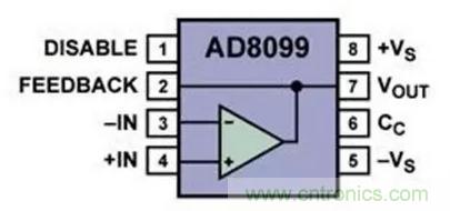 採用低失真引腳排列的一些運算放大器,有助于消除上面提及的兩個問題;而且它還提高了其他兩個重要方面的性能。LFCSP的低失真引腳排列,如(圖十)所示,將傳統(tǒng)運算放大器的引腳排列按著逆時針方向移動一個引腳,并且增加了一個輸出引腳作為專用的反饋引腳。