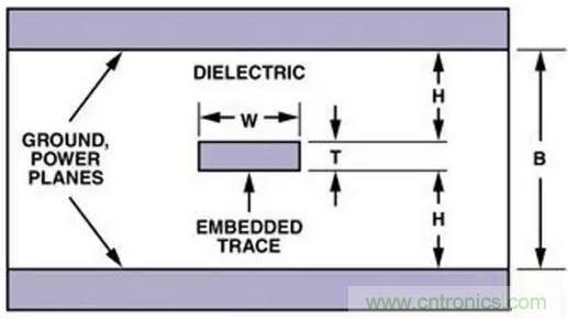帶狀控制阻抗印制線(圖十四)採用了兩層接地平面,信號印制線夾在其中。這種方法使用了較多的印制線,需要的PCB層數(shù)更多,對電介質(zhì)厚度變化敏感,而且成本更高,所以通常只用于要求嚴格的應用中。