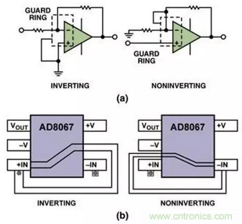 (公式七)保護環(huán),或者稱隔離環(huán),是運算放大器常用的另一種遮罩方法,它用于防止寄生電流進入敏感結(jié)點。其基本原理很簡單,用一條保護導線將敏感結(jié)點完全包圍起來,導線保持或者迫使它保持(低阻抗)與敏感結(jié)點相同的電勢,因此使吸收的寄生電流遠離了敏感結(jié)點。(圖十五)(a)顯示了用于運算放大器反相配置和同相配置中保護環(huán)的原理圖。圖十五(b)則顯示用于SOT-23-5封裝中兩種保護環(huán)的典型佈線方法。