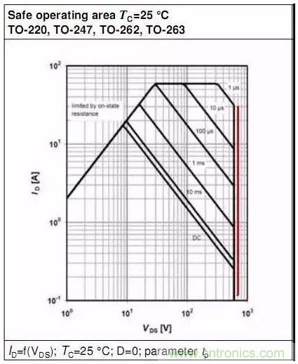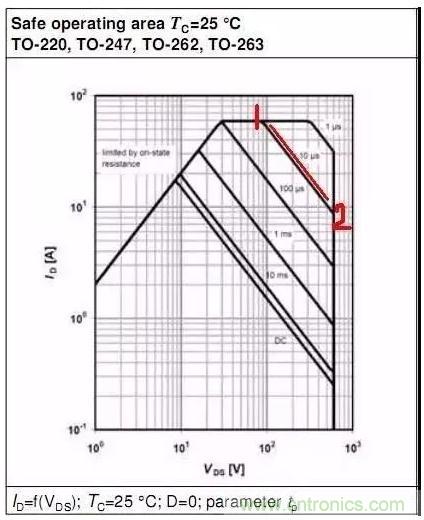 此圖中:當VDS=1V時,Y軸對應的ID為2A,Rds=VDS/ID=0.5R ==>Tj=150℃時,Rds(on)約為0.5R.當VDS=10V時,Y軸對應的ID為20A,Rds=VDS/ID=0.5R ==>Tj=150℃時,Rds(on)約為0.5R.所以,此部分曲線中,SOA表現(xiàn)為Tj_max時RDS(on)的限制.