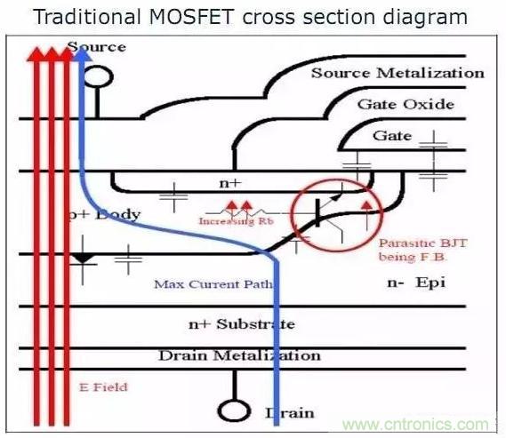 在MOSFET的結構中,實際上是存在一個寄生三極管的,如上圖。在MOSFET的設計中也會采取各種措施去讓寄生三極管不起作用,如減小P+Body中的橫向電阻RB。正常情況下,流過RB的電流很小,寄生三極管的VBE約等于0,三極管是處在關閉狀態(tài)。雪崩發(fā)生時,如果流過RB的雪崩電流達到一定的大小,VBE大于三極管VBE的開啟電壓,寄生三極管開通,這樣將會引起MOSFET無法正常關斷,從而損壞MOSFET。