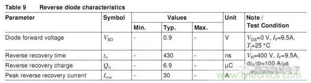 VSD,二極管正向壓降 ==>這個參數(shù)不是關注的重點,trr,二極管反向回復時間 ==>越小越好,Qrr,反向恢復電荷 ==>Qrr大小關系到MOSFET的開關損耗,越小越好,trr越小此值也會小
