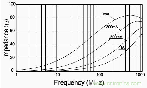 圖1是電流通過片狀鐵氧體磁珠時(shí)的阻抗值的變化示例。