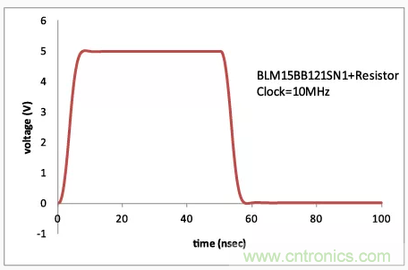 如果在數(shù)字電路中使用鐵氧體磁珠,則可能會發(fā)生波形中出現(xiàn)過沖和下沖的情況。(圖2)