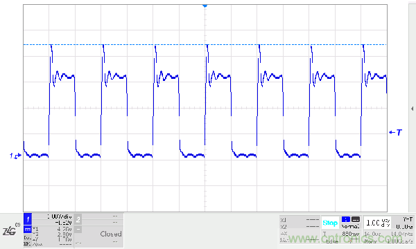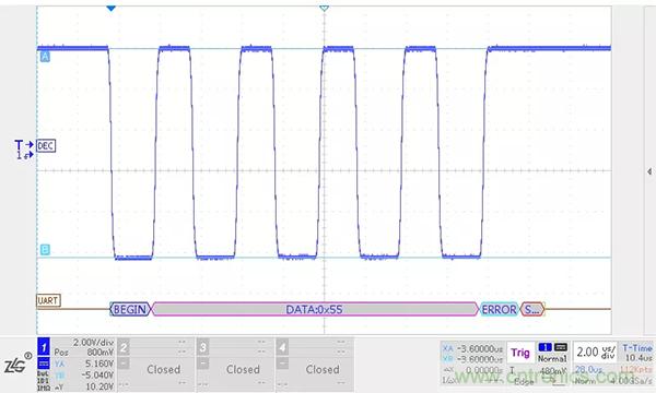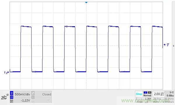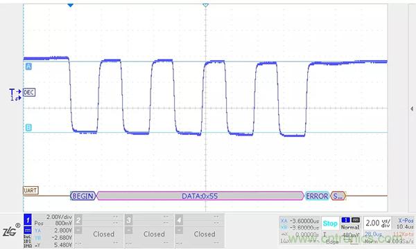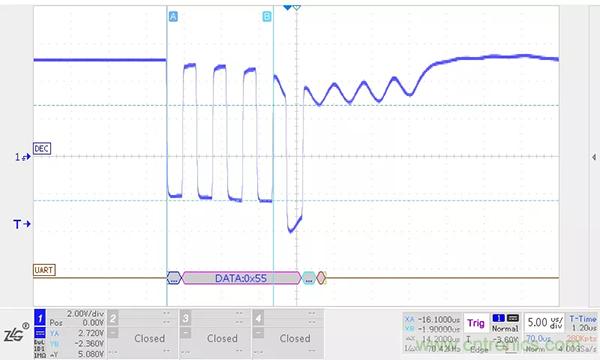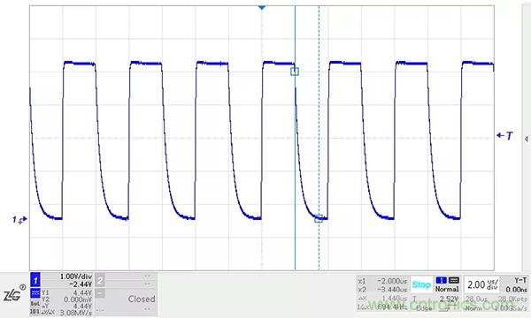 在顯性狀態(tài)期間,總線的寄生電容會被充電,而在恢復到隱性狀態(tài)時,這些電容需要放電。如果CANH、CANL之間沒有放置任何阻性負載,電容只能通過收發(fā)器內部的差分電阻放電。我們在收發(fā)器的CANH、CANL之間加入一個220PF的電容進行模擬試驗,位速率為500kbit/s,波形如下圖所示。