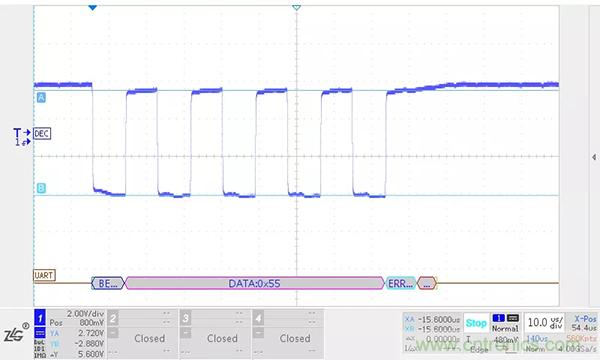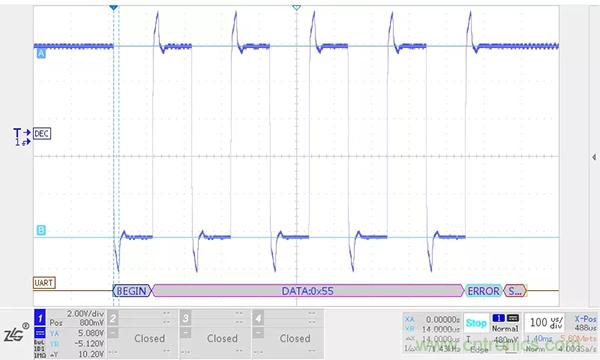 RS-485總線上的負載越大,RS-485收發(fā)器輸出差分電壓幅值越低,RSM485ECHT在5m,500kbps的情況下不加終端電阻和加終端電阻的波形如下圖所示。
