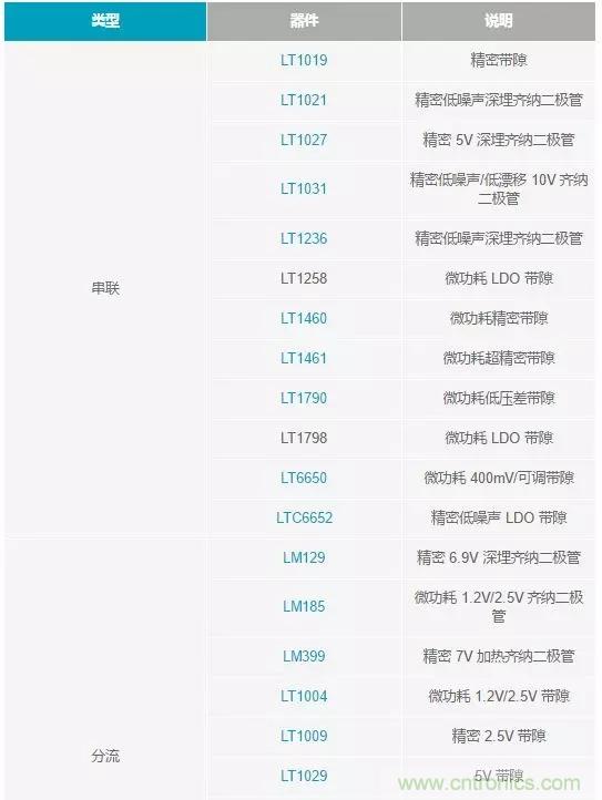 ADI生產(chǎn)各種各樣的帶隙基準(zhǔn)電壓源,包括小型廉價(jià)精密串聯(lián)基準(zhǔn)電壓源LT1460、超低功耗分流基準(zhǔn)電壓源LT1389以及超高精度、低漂移基準(zhǔn)電壓源LT1461和LTC6652??捎幂敵鲭妷喊?.2V、1.25V、2.048V、2.5V、3.0V、3.3V、4.096V、4.5V、5V和10V。這些基準(zhǔn)電壓可以在很寬范圍的電源和負(fù)載條件下提供,并且電壓和電流開銷極小。產(chǎn)品可能具有非常高的精度,例如 LT1461、LT1019、 LTC6652 和 LT1790;尺寸可能非常小,例如 LT1790 和 LT1460 (SOT23),或采用 2 m m× 2 m m D F N 封裝的 LT6660;或者功耗非常低,例如 LT1389,其功耗僅需 800nA。雖然齊納基準(zhǔn)電壓源在噪聲和長(zhǎng)期穩(wěn)定性方面往往具有更好的性能,但新的帶隙基準(zhǔn)電壓源正在縮小差距,例如 LTC6652 的峰峰值噪聲 (0.1Hz 至 10Hz) 為 2ppm。