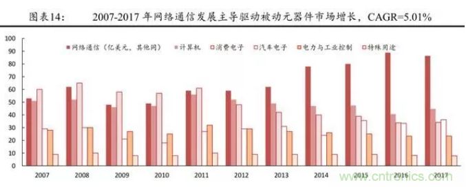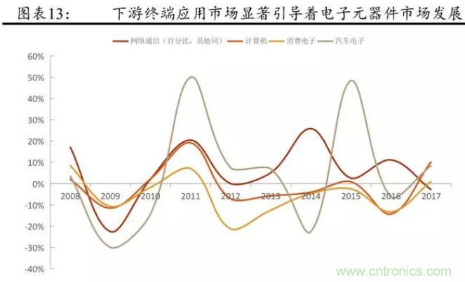 從被動(dòng)元件的發(fā)展歷程來看,近些年來,產(chǎn)業(yè)鏈下游的需求擴(kuò)大主導(dǎo)著被動(dòng)元件市場(chǎng)的擴(kuò)張。金融危機(jī)以來,全球電子元件市場(chǎng)規(guī)模的增長(zhǎng)主要來自于網(wǎng)絡(luò)通信與汽車電子,尤其是智能手機(jī)。