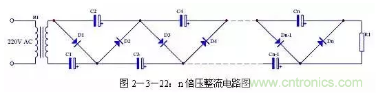 二倍壓電路還可以很容易的擴(kuò)展為n倍壓電路,具體電路見圖2-3-22。