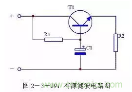 當(dāng)對(duì)濾波效果要求較高時(shí),可以通過(guò)增加濾波電容的容量來(lái)提高濾波效果。但是受電容體積限制,又不可能無(wú)限制增大濾波電容的容量,這時(shí)可以使用有源濾波電路。其電路形式見圖2-3-29,其中電阻R1是三極管T1的基極偏流電阻,電容C1是三極管T1的基極濾波電容,電阻R2是負(fù)載。這個(gè)電路實(shí)際上是通過(guò)三極管T1的放大作用,將C1的容量放大β倍,即相當(dāng)于接入一個(gè)(β+1)C1的電容進(jìn)行濾波。