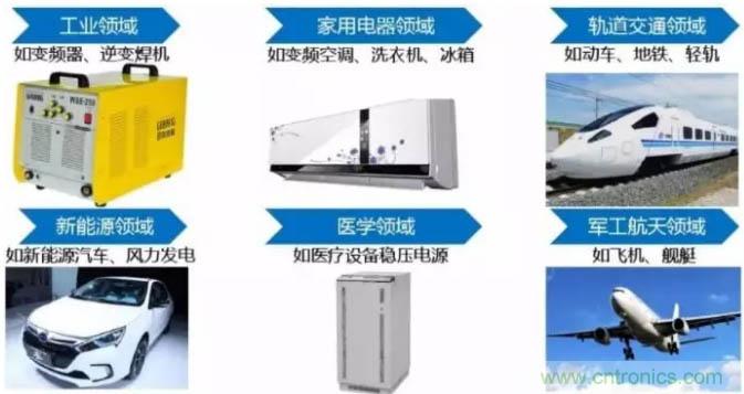 作為新型功率半導(dǎo)體器件的主流器件,IGBT已廣泛應(yīng)用于工業(yè)、 4C(通信、計算機、消費電子、汽車電子)、航空航天、國防軍工等傳統(tǒng)產(chǎn)業(yè)領(lǐng)域,以及軌道交通、新能源、智能電網(wǎng)、新能源汽車等戰(zhàn)略性新興產(chǎn)業(yè)領(lǐng)域。