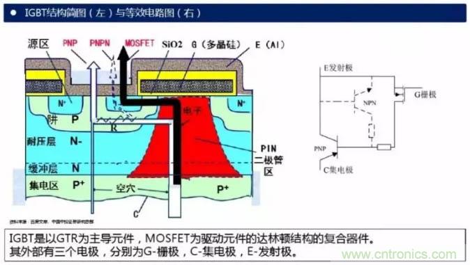 IGBT是以GTR為主導(dǎo)元件,MOSFET為驅(qū)動元件的達林頓結(jié)構(gòu)的復(fù)合器件。其外部有三個電極,分別為G-柵極,C-集電極,E-發(fā)射極。