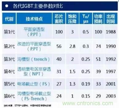 1985年前后美國GE成功試制工業(yè)樣品(可惜后來放棄)。自此以后, IGBT主要經(jīng)歷了6代技術(shù)及工藝改進。