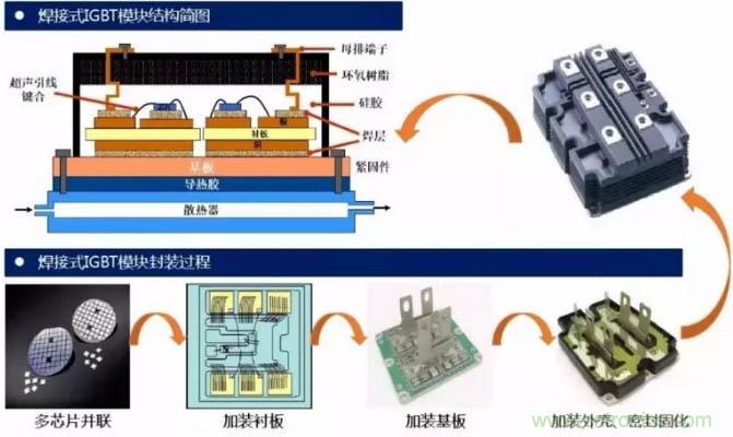 IGBT模塊按封裝工藝來看主要可分為焊接式與壓接式兩類。高壓IGBT模塊一般以標準焊接式封裝為主,中低壓IGBT模塊則出現(xiàn)了很多新技術(shù),如燒結(jié)取代焊接,壓力接觸取代引線鍵合的壓接式封裝工藝。