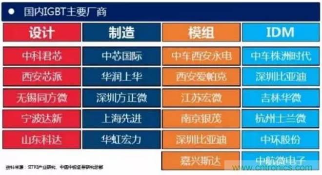 從公司來看,國外研發(fā)IGBT器件的公司主要有英飛凌、 ABB、三菱、西門康、東芝、富士等。中國功率半導(dǎo)體市場占世界市場的50%以上,但在中高端MOSFET及IGBT主流器件市場上,90%主要依賴進口,基本被國外歐美、日本企業(yè)壟斷。