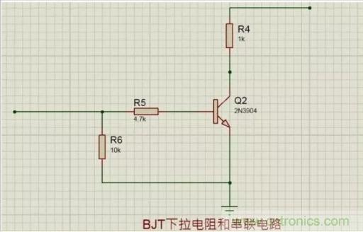 在BJT晶體三極管的基極端,上拉電阻和下拉電阻也起著至關(guān)重要的作用。在三極管的電路應(yīng)用中,串接在基極上的電阻起限制基級電流的作用,如下圖中的R2所示,