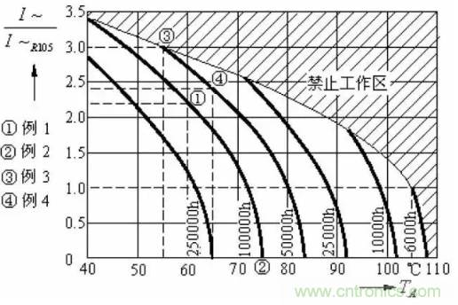 溫度、電壓、紋波電流共同作用對壽命的影響。以某電子鎮(zhèn)流器用鋁電解電容器為例。在不同的電壓與溫度條件下的鋁電解電容器壽命不同。