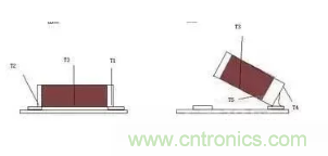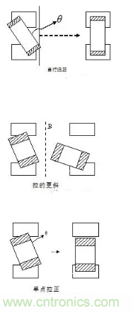 當(dāng)貼片時,由于焊墊的不平或焊膏的滑動,造成片感偏移了θ角。由于焊墊熔融時產(chǎn)生的潤濕力,可能形成以上三種情況,其中自行歸正為主,但有時會出現(xiàn)拉的更斜,或者單點拉正的情況,片感被拉到一個焊盤上,甚至被拉起來,斜立或直立(立碑現(xiàn)象)。目前帶θ角偏移視覺檢測的貼片機可減少此類失效的發(fā)生。