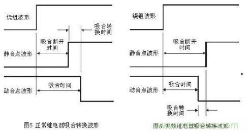 轉(zhuǎn)換時(shí)間包括吸合轉(zhuǎn)換時(shí)間和釋放轉(zhuǎn)換時(shí)間。以吸合轉(zhuǎn)換時(shí)間為例,繼電器在吸合過(guò)程中,靜合點(diǎn)斷開(kāi)時(shí)間與動(dòng)合點(diǎn)吸合時(shí)間之差稱(chēng)為吸合轉(zhuǎn)換時(shí)間。圖5和圖6分別顯示了合格繼電器和失效繼電器的吸合轉(zhuǎn)換波形。