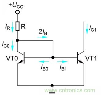 如圖1所示為鏡像恒流源電路,它由兩只特性完全相同的管子VT0和VT1構(gòu)成,由于VT0管的c、b極連接,因此UCE0=UBE0,即VT0處于放大狀態(tài),集電極電流IC0=β0*IB0。另外,管子VT0和VT1的b-e分別連接,所以它們的基極電流IB0=IB1=IB。設(shè)電流放大系數(shù)β0=β1=β,則兩管集電極電流IC0=IC1=IC=β*IB??梢?jiàn),由于電路的這種特殊接法,使兩管集電極IC1和IC0呈鏡像關(guān)系,故稱(chēng)此電路為鏡像恒流源(IR為基準(zhǔn)電流,IC1為輸出電流)。