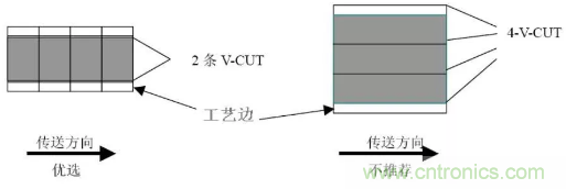 拼板方向應平行傳送邊方向設(shè)計, 當尺寸不能滿足上述拼版尺寸要求的例外。一般要求“V-CUT”或郵票孔線數(shù)量≤3(對于細長的單板可以例外),見圖3.4。