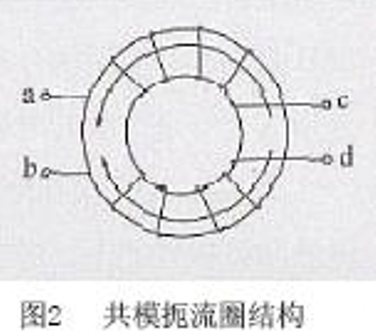 圖1 是開關電源EMI 濾波器的電路。其中L1、L2為共模扼流圈,其結構見圖2。由于它的兩個線圈匝數(shù)相等,這兩個電感對于差模電流和主電流所產(chǎn)生的磁通是方向相反、互相抵消的,因而不起作用;而對于共模干擾信號,能夠得到一個大的電感量呈現(xiàn)高阻抗,以獲得最大的濾波效果,因此對其有良好的抑制作用。但是,由于種種原因,如磁環(huán)的材料不可能做到絕對均勻,兩個線圈的繞制也不可能完全對稱等,使得L1和L2的電感量是不相等的,于是,(L1- L2)形成差模電感,它和L3與L4形成的獨立差模抑制電感與Cx電容器又組成L - N 獨立端口間的一個低通濾波器,用來抑制電源線上存在的差模干擾信號。