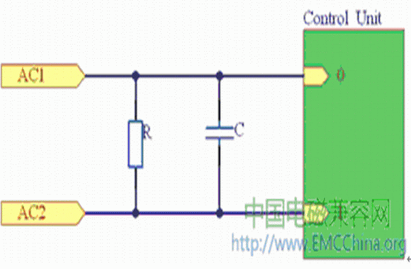 為了防止控制板電路產(chǎn)生的傳導干擾,可在電路的進入口(即AC兩端)并接上一個電容C,圖1所示是一個簡單的電容抗擾電路連接圖。圖中的電容屬于安全電容,但必須在該電容的兩端并聯(lián)一個安全電阻,以防止電源線拔插時電源線插頭長時間帶電。因為安全標準規(guī)定,當正在工作之中的機器電源線被拔掉時,在兩秒鐘內,電源線插頭兩端所帶的電壓(或對地電位)應小于原來電壓的30%。