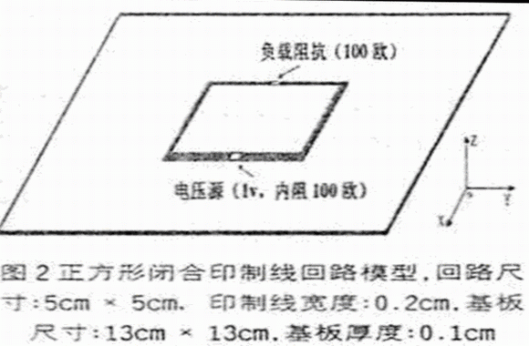 這是一種帶有接地平面的正方形的閉合印制線環(huán)路,在回路的兩端分別接有電壓源和阻抗相等的源內(nèi)阻、負(fù)載,當(dāng)電壓信號(hào)的頻率較高時(shí),這種結(jié)構(gòu)與方環(huán)形天線是非常相似的,成為一種嚴(yán)重的輻射源。