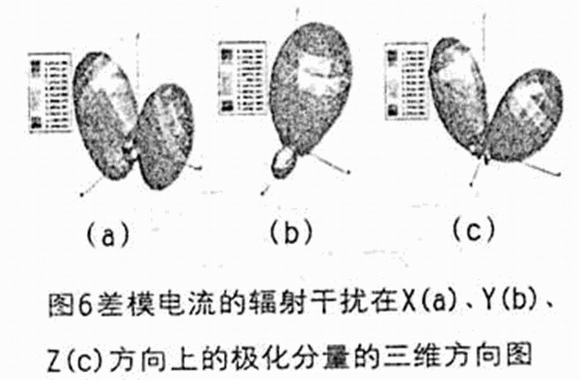 閉合印制線回路上流過(guò)的差模電流產(chǎn)生的輻射干擾在各個(gè)極化方向上的分布是不同的。圖6是矩形印制線回路的源和終端所在的邊為3(回路面積為25)時(shí)頻率為1.5GHz差模電流的輻射干擾在X、Y、Z方向上的極化分量的三維方向圖,從圖中可以看到,X和Z方向上的極化分量主要集中于印制板正面的X軸的兩側(cè),而Y方向上的極化分量主要集中于印制板的正上方區(qū)域,并且沿Y方向的極化分量最大,分別為X、Y方向極化分量的兩倍左右,對(duì)于源和終端所在邊為2cm、4cm和5cm時(shí)的閉合回路也是如此。