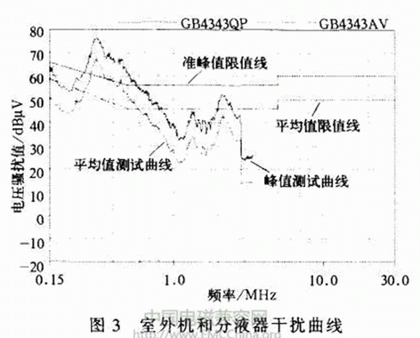 從圖2可以看出,測(cè)量的連續(xù)干擾電壓的峰值曲線(xiàn)和平均值曲線(xiàn)均沒(méi)有超過(guò)限值線(xiàn),且有一定的裕量,由此可以排除室外機(jī)控制器和壓縮機(jī)干擾的可能。