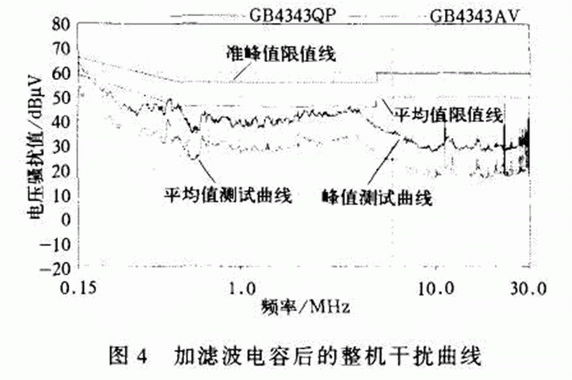 由圖4和表2可以看出,在加了濾波電容后,超出限值線(xiàn)的干擾均被濾掉。在實(shí)際應(yīng)用中,單一的電容器不可能在從低頻段到高頻段都能令人滿(mǎn)意。這種情況下可以將兩個(gè)不同類(lèi)型的電容器并聯(lián)使用,會(huì)取得良好的效果。