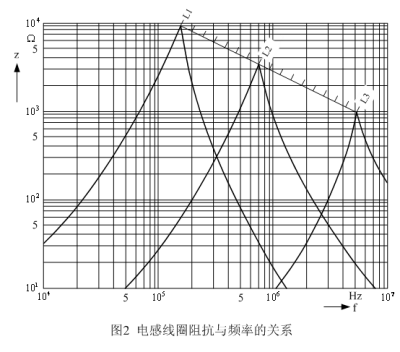 圖2是普通電感線圈的阻抗與頻率的關(guān)系圖,由圖中可以看出,電感線圈的阻抗開始的時候是隨著頻率升高而增大的,但當(dāng)它的阻抗增大到最大值以后,阻抗反而隨著頻率升高而迅速下降,這是因為并聯(lián)分布電容的作用。當(dāng)阻抗增到最大值的地方,就是電感線圈的分布電容與等效電感產(chǎn)生并聯(lián)諧振的地方。圖中,L1 > L2 > L3,由此可知電感線圈的電感量越大,其諧振頻率就越低。從圖2中可以看出,如果要對頻率為1MHz的干擾信號進(jìn)行抑制,選用L1倒不如選用L3,因為L3的電感量要比L1小十幾倍,因此L3的成本也要比L1低很多。